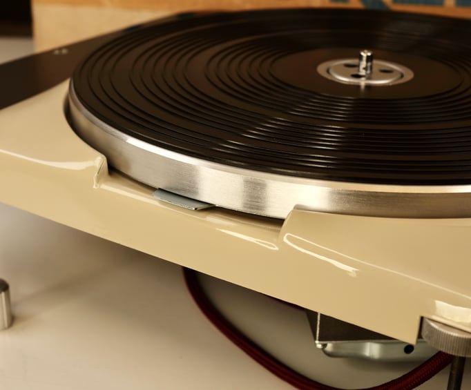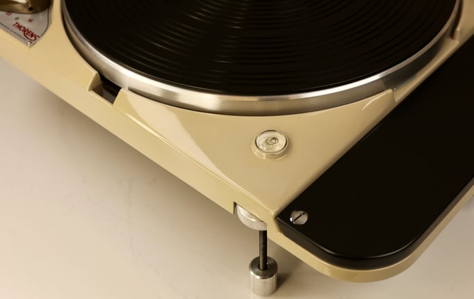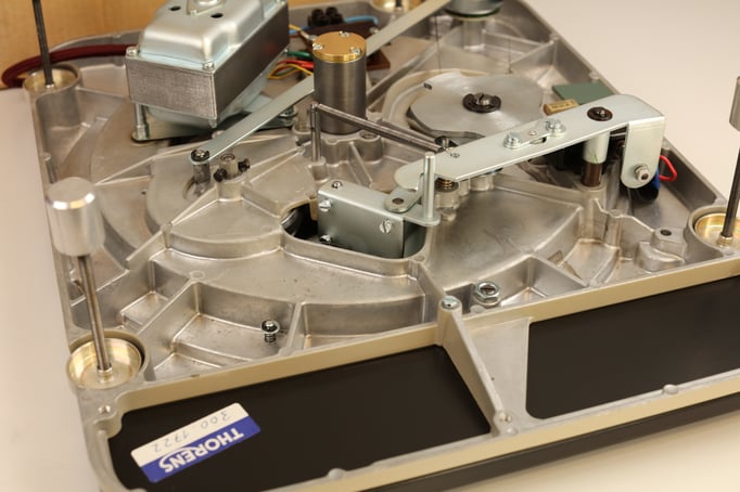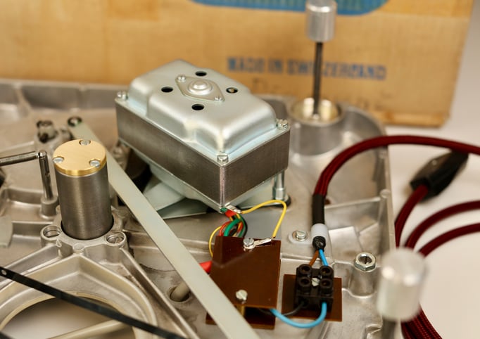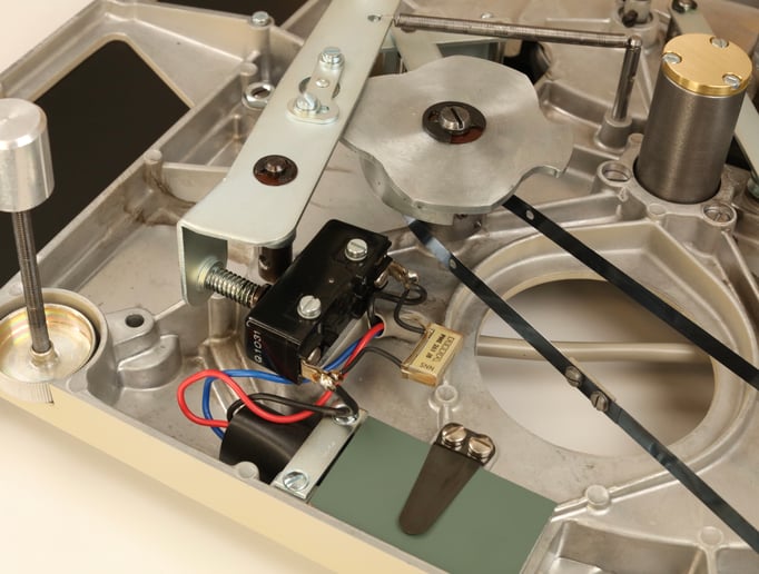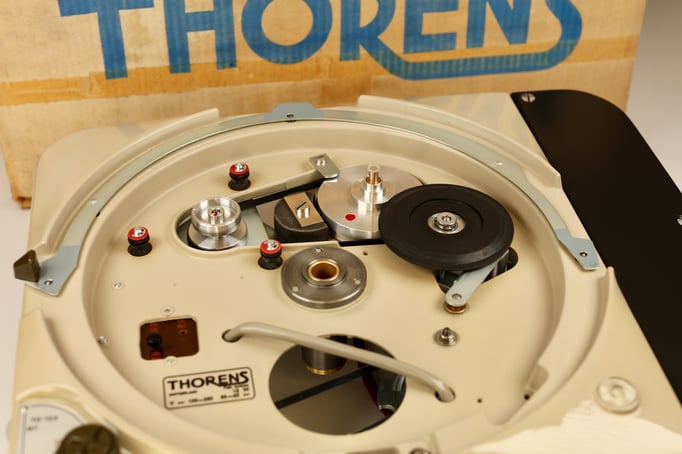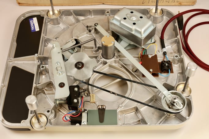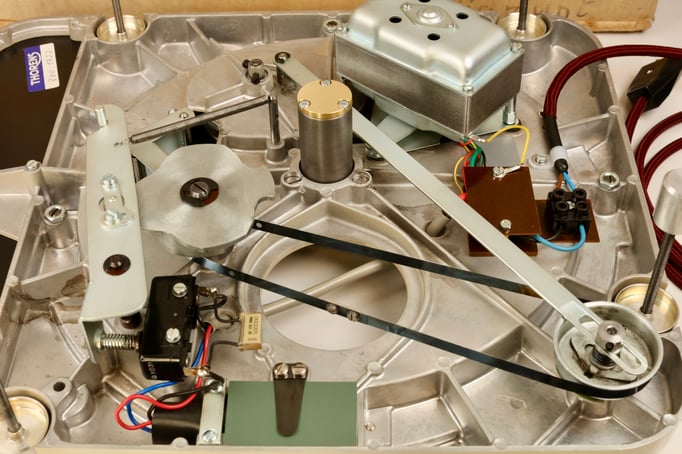Neben einem neuen original Thorens Reibrad wurden sämtliche Sinterbronzelager wie zum Beispiel beim Hauptlager, dem Stufenrad, Motor etc. ersetzt. Ebenso wurden sämtliche Metallteile neu verzinkt.