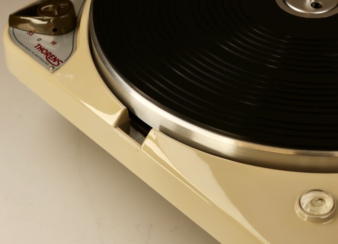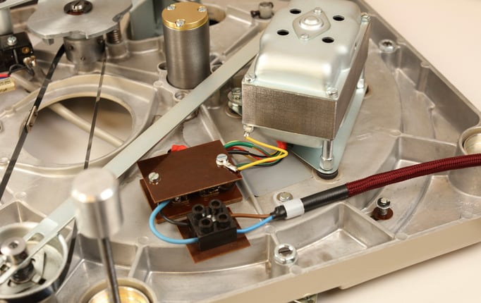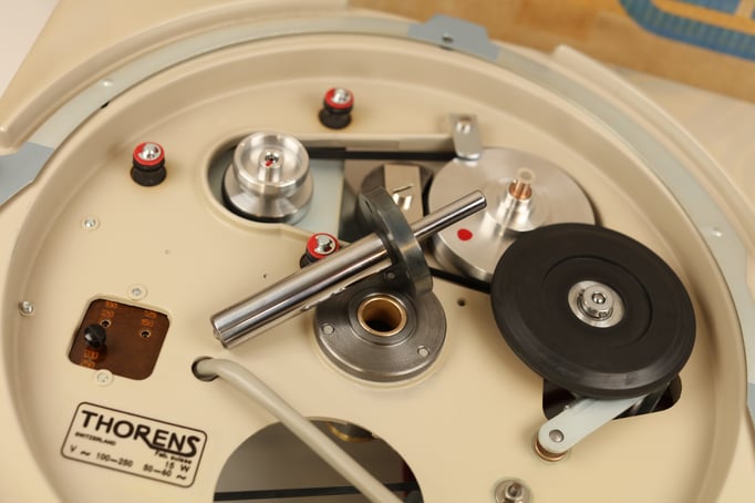 In addition to our very complex full-restoration, we also re-plated all sheet-metal parts and motor-covers. ALL bearing bushings (main bearing, stepped wheel etc.) have been replaced as well. A brand new N.O.S. genuine Thorens idler wheel has also been installed.